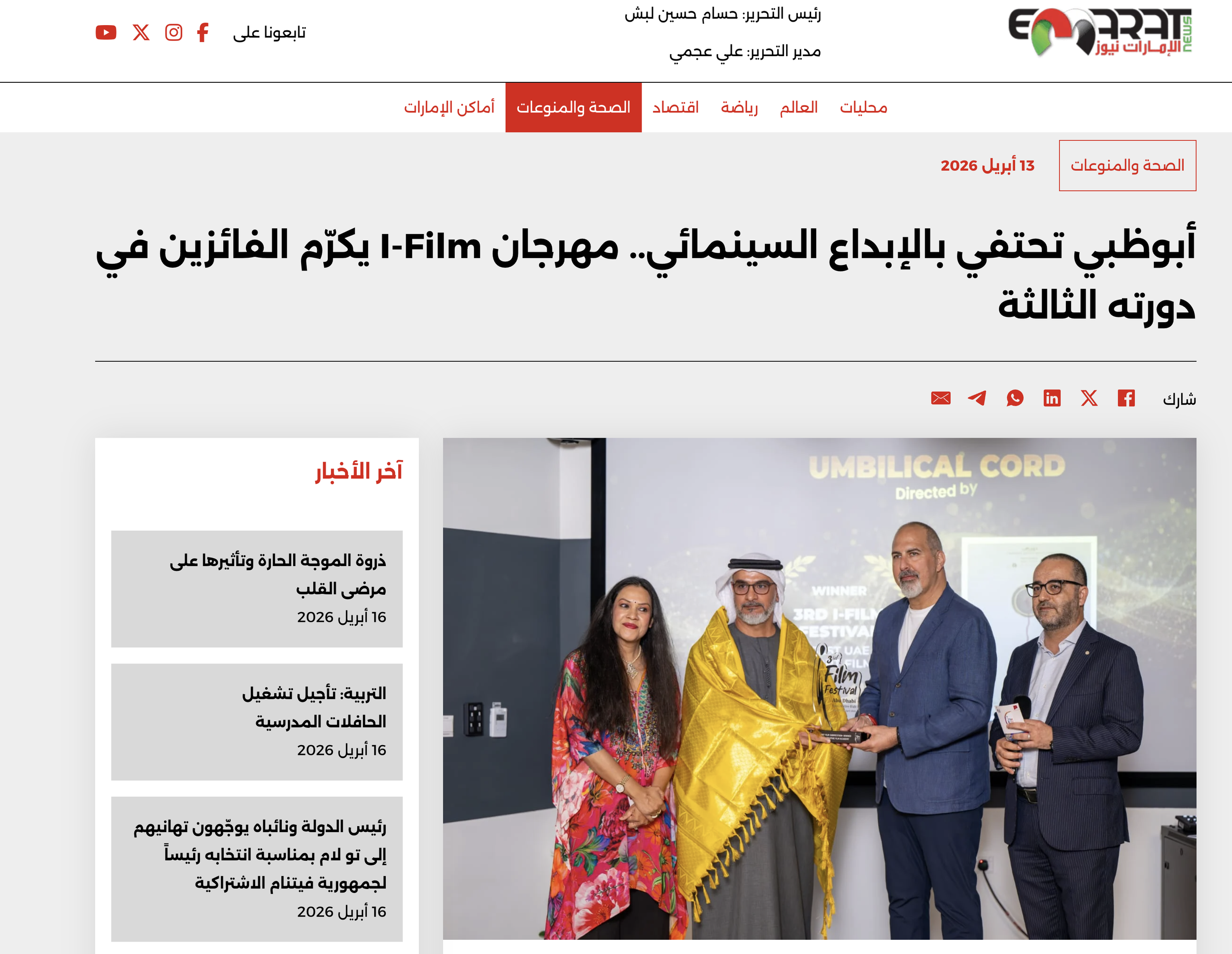 في مشهد سينمائي يعكس تنامي الحراك الإبداعي في دولة الإمارات، أعلن مهرجان I-Film السينمائي الدولي عن قائمة الفائزين في دورته الثالثة، التي احتضنتها منطقة ياس الإبداعية في توفور54 بجزيرة ياس في أبوظبي، وسط حضور لافت لصنّاع الأفلام والمهتمين بالصناعة السينمائية من مختلف أنحاء العالم.